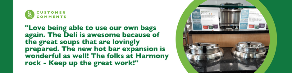 Harmony strives to serve the common health of our community by providing opportunities to celebrate and consume good food through cooperative ownership and sustainable partnerships. We recognize the need for healthful, sustainable, and environmentally conscious practices in our community and on Earth, and operate accordingly.