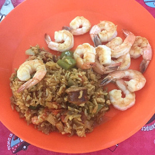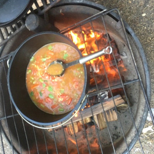 The jambalaya consisted of andouille turkey sausage (you can substitute any spicy or not spicy sausage). We cut the andouille in chunks and browned it first and set aside. Next we sautéed diced green and poblano peppers, onions, garlic and wild lobster mushrooms in oil. Then blended in a portion of the basmati to pick up these flavors. We added fresh thyme, cayenne pepper, chili powder, diced canned tomatoes, fresh tomatoes (home grown), chicken broth and brown basmati and simmered that over the campfire for about 16 or so minutes. Then we added the lobster and andouille, a little more broth for consistency and finished cooking about 8 more minutes. Kay and Ann sautéed a few shrimp to go with their portions.